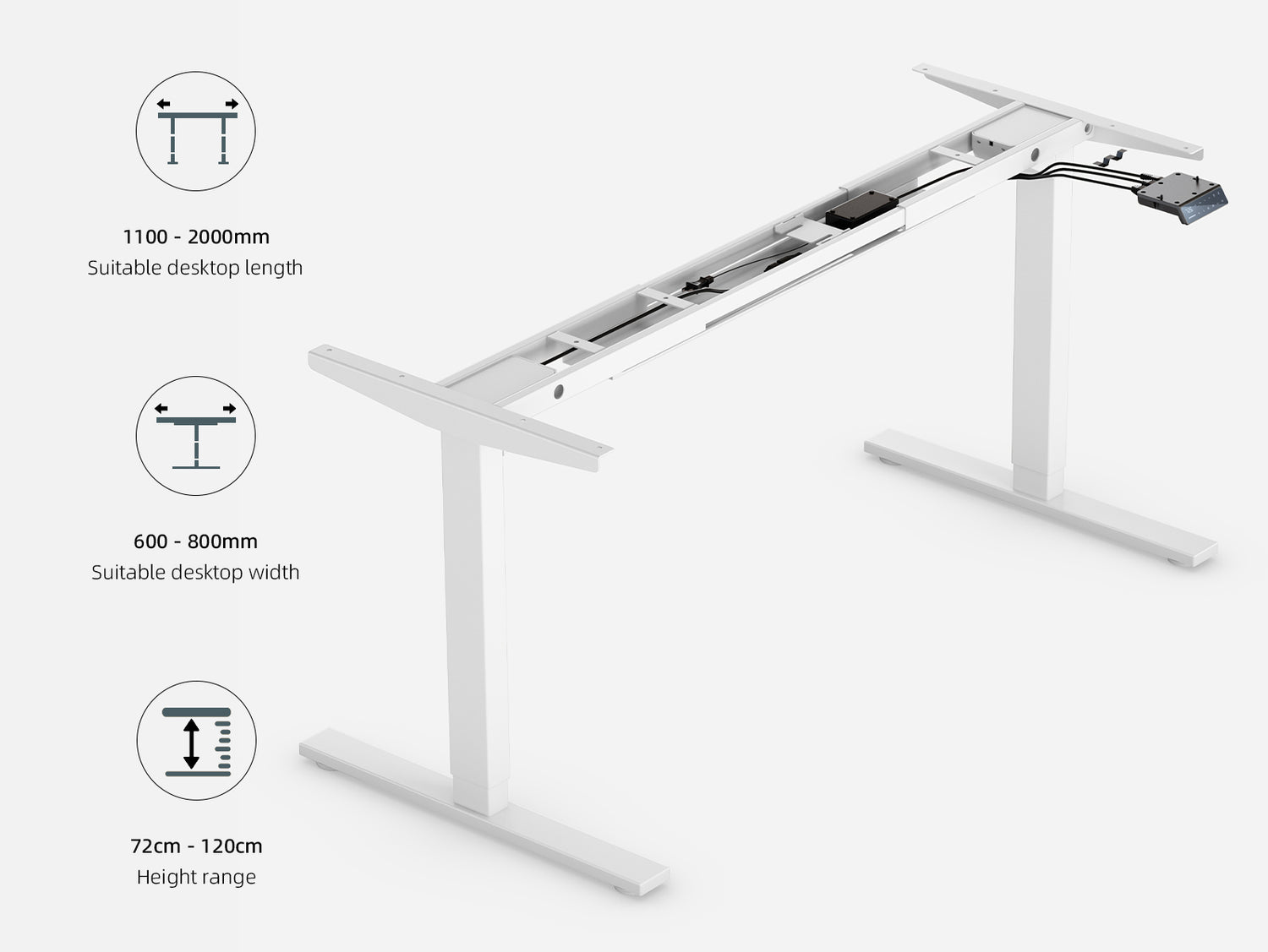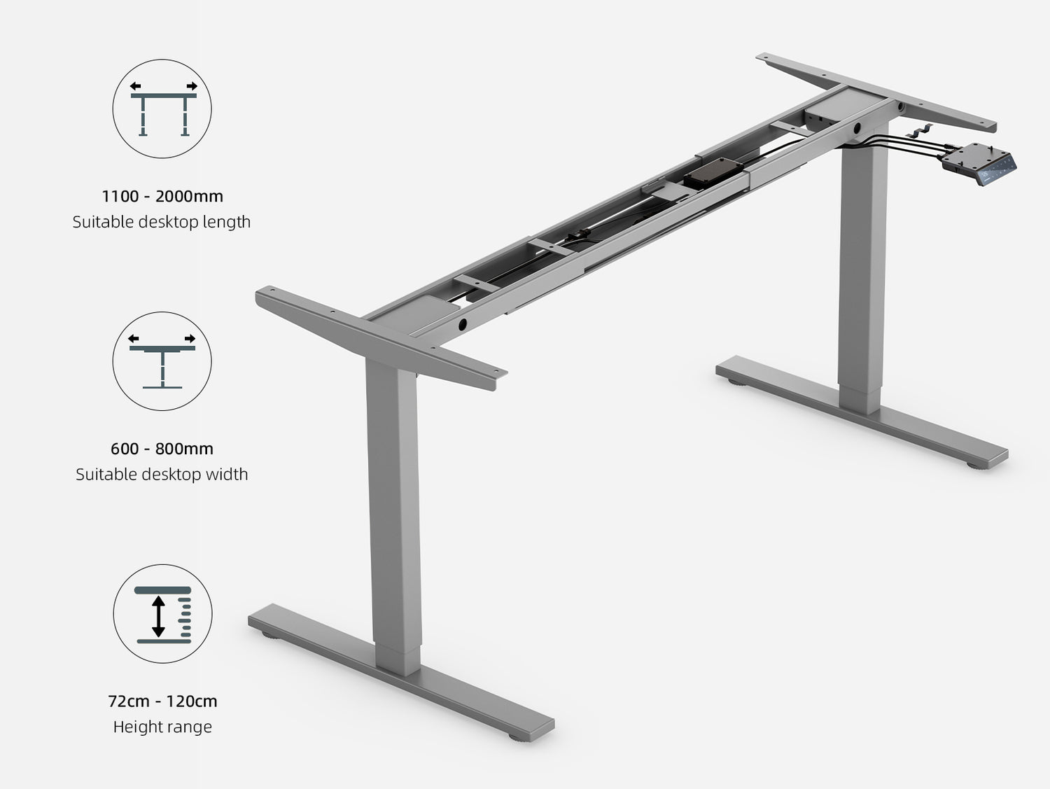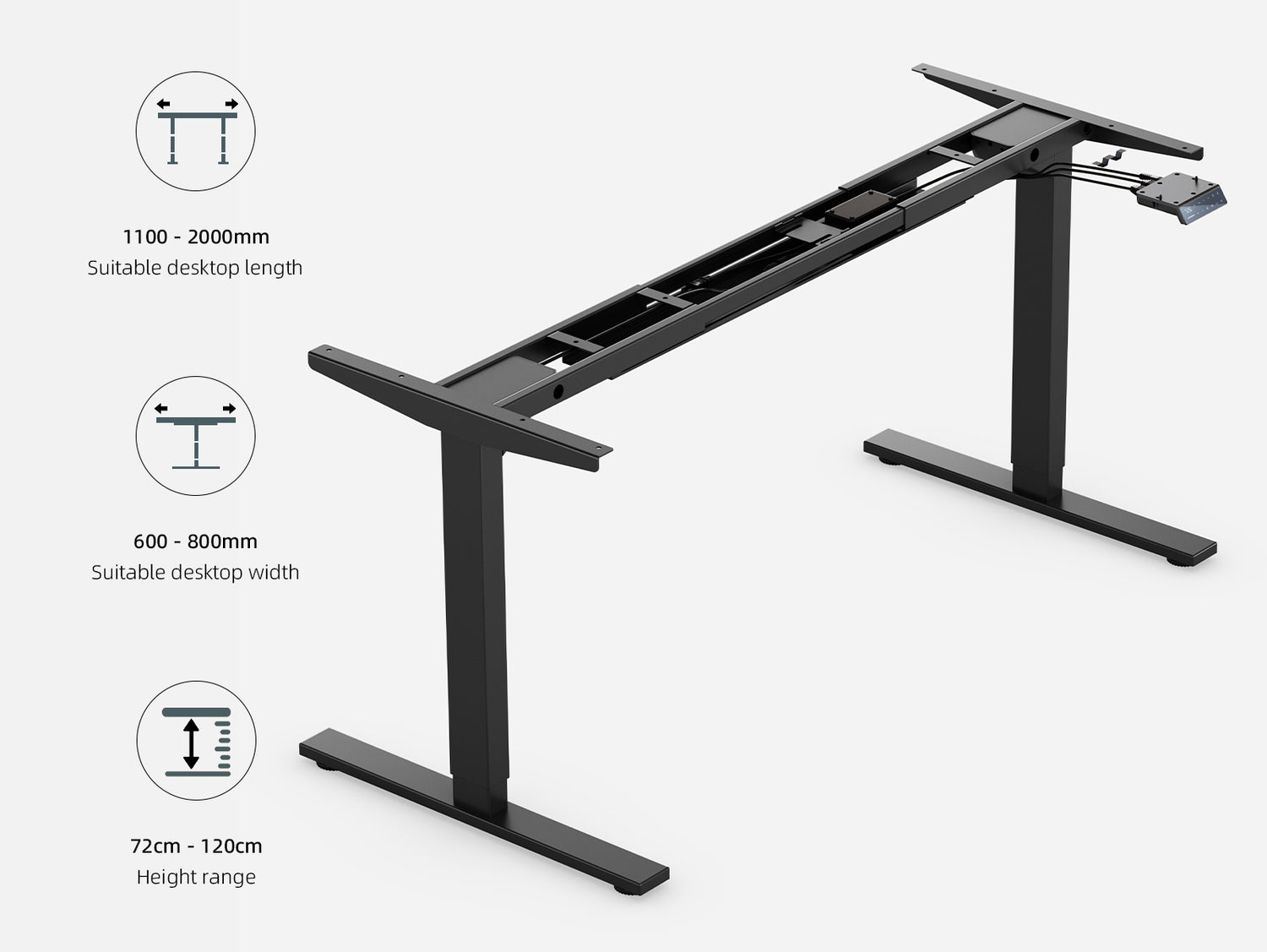 - Our extendable standing desk frame adapts perfectly to table tops from 110 to 200 cm wide and 60 to 80 cm deep.