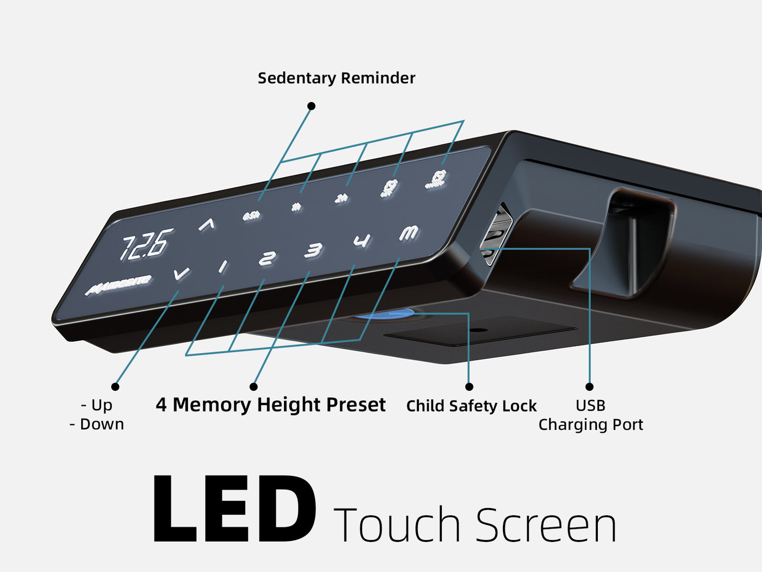 - The multifunctional control panel includes sit-stand reminder, 4 programmable height settings, USB charging function and collision protection.